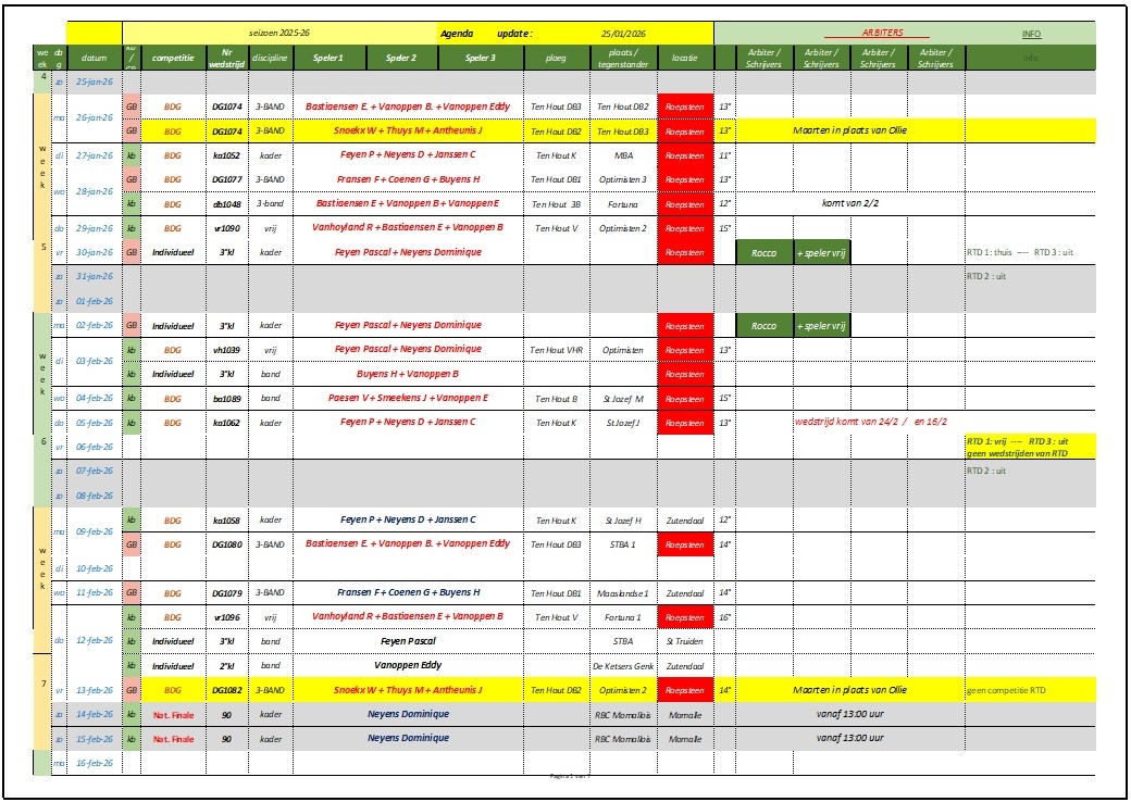Wegens dubbel bezetting van diverse spelers hier wijziging die aangevraagd zijn en goedgekeurd: BDG vrij hogere reeks - vh1002 - " St Jozef F // Ten Hout vhr " van do 28-8-25 naar ma 25/8/25 = ploeg Ten Hout vhr BDG 3-BAND GB - DG1002 - " Ten Hout DB1 // Ten Hout DB2 " van wo 03-09-25 naar wo 27/08/25 = ploeg Ten Hout DB1 + Ten Hout DB2 BDG 3-BAND GB - DG1005 - " Ten Hout DB3 // Optimisten 3 " van ma 01-09-25 naar vr 29/08/25 = ploeg Ten Hout DB3 BDG 3-BAND GB - DG1014 - " STBA 1 // Ten Hout DB3 " van do 18-09-25 naar wo 17/09/25 = ploeg Ten Hout DB3 BDG 3-band kb - db1008 - " STBA 1 // Ten Hout DB " van dI 09-09-25 naar ma 08/09/25 = ploeg Ten Hout db BDG 3-band kb - db1015 - " Ten Hout db // KSTBC " van ma 29-09-25 naar do 25/09/25 = ploeg Ten Hout db BDG 3-BAND GB - DG1014 - " STBA 1 // Ten Hout DB3 " van do 18-09-25 naar wo 17/09/25 = pl oeg Ten Hout DB3 BDG vrij - vr1025 - " St Jozef B // Ten Hout V " van ma 22-09-25 naar di 23/09/25 = ploeg Ten Hout V BDG kader - ka1007 - " MBA // Ten Hout K " van vr 12-09-25 naar do 11/09/25 = ploeg Ten Hout k |